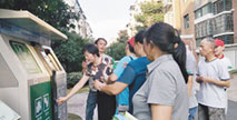 在越城區(qū)蕺山街道岑草園一期小區(qū),居民們正在社區(qū)干部的指導(dǎo)下,嘗試刷卡投放垃圾。當(dāng)天,這個小區(qū)的居民們首次領(lǐng)到了智能卡,今后他們將使用智能設(shè)備分類投放垃圾...