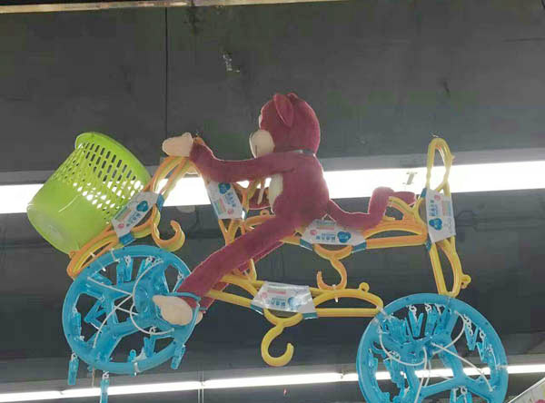 在這家超市的日用品售賣(mài)區(qū),“猴兒騎自行車(chē)”掛在頂棚處,兩個(gè)衣架為車(chē)輪,若干個(gè)衣掛組成扶手、橫梁、車(chē)座,垃圾桶則恰到好處地在車(chē)前成為車(chē)筐。整個(gè)造型創(chuàng)意十足、形象逼真、顏色鮮艷、熱鬧有趣,很多逛超市的市民看到了都感嘆“太有才啦!”。