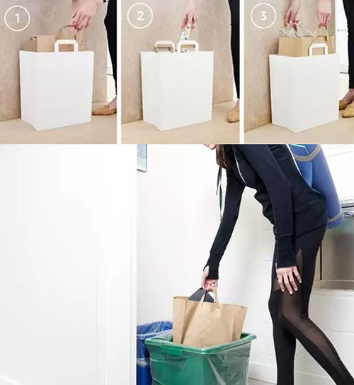 它的正確使用方式是搭配上購(gòu)物紙袋,這一點(diǎn)和我們的習(xí)慣似乎不太一樣,也許是因?yàn)槊绹?guó)購(gòu)物時(shí)使用紙袋更多,勤儉持家的家庭主婦們將這些紙袋用作垃圾袋,可是紙袋不夠牢固,放上東西便會(huì)東倒西歪,有這樣一個(gè)垃圾桶正好解決問題,其實(shí)它的外形也和購(gòu)物紙袋有些相似呢。當(dāng)然,將紙袋換成我們習(xí)慣的塑料袋,照樣可以優(yōu)雅地裝垃圾。它有黑白兩色可選,放在辦公室、廚房均可。
