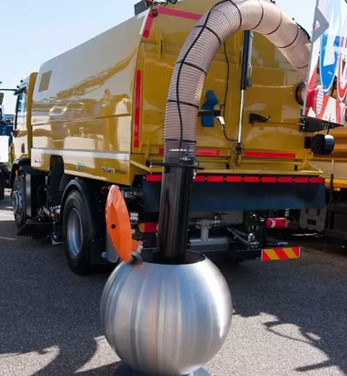 該系統(tǒng)配有專用工作車輛,在車身背后配掛一根超長的管子,掀開泡泡垃圾桶的蓋子,司機取下管子,把管子從上方放入圓球,利用產(chǎn)生高效的空氣旋渦,就像一臺強勁的吸塵器快速把垃圾集速吸走。這樣一來,既減少了管理上的人工、物耗,又不會造成路面多余的污漬痕跡。